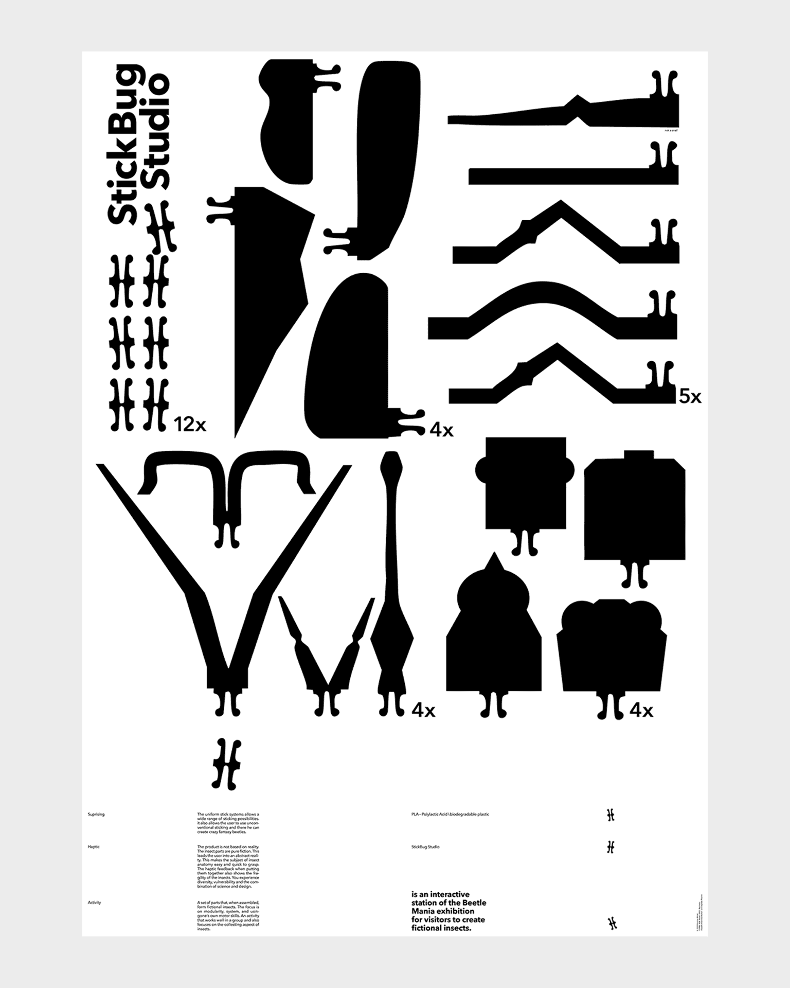Stickbug Studio is a kit for building beetles by sticking the pieces together. All of the parts are 3D-printed. I used the silhouettes of the individual pieces to design a poster and created a stop-motion animation to demonstrate how to use the product.